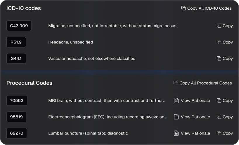 Automated ICD-10 pipelines tailored to neurologic conditions (e.g., stroke, seizure disorders) and CPT coding support to aid revenue cycle accuracy.